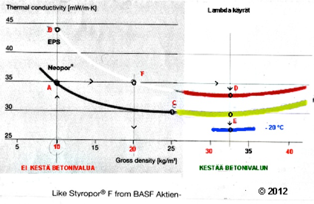Kuten lambda- käyrästä selviää, on esim pehmeällä ja vettä imevällä kevyellä 20 kg/ m3 styroksi vaahdolla selvästi huonompi läämöneristys kuin 35 koloisella tuotteella.