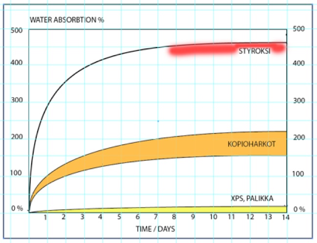 Pehmeä styroksi myös imee kapillaariesti paljon vettä, erityisesti